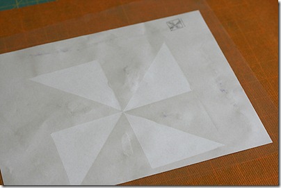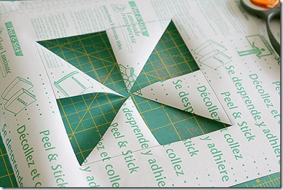 Start by making your template with your contact paper. I am a huge fan of pinwheel quilts so I went with a pinwheel pattern for this. Essentially, you could do any kind of design. I drew out a square on the paper side of the contact paper. Then I drew diagonal lines and then a horizontal and vertical lines intersecting in the middle. I just cut out every other triangle and left the negative ones attached.