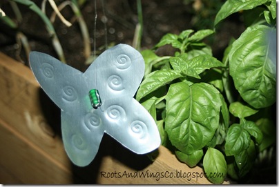 If you look closely at this one you can see that I used a set of those metal stamps to engrave “Roots & Wings” into this butterfly (along the bottom of the butterfly, in the center). I thought this was cute because that’s the name of our blog (obviously) but it was even more appropriate for where this mobile is going to live-in my garden. Plant roots and butterfly wings! So cute, right?!