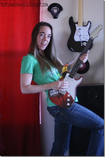 So I’ve decided to make a music wall surrounding my entertainment center. It will kill 2 birds with one stone. #1 is that it clears the clutter from all of our instruments (from Rock Band and Paper Jamz) being on the floor. #2 is the decorative side of things. I think my house is already Rockin’ the look!